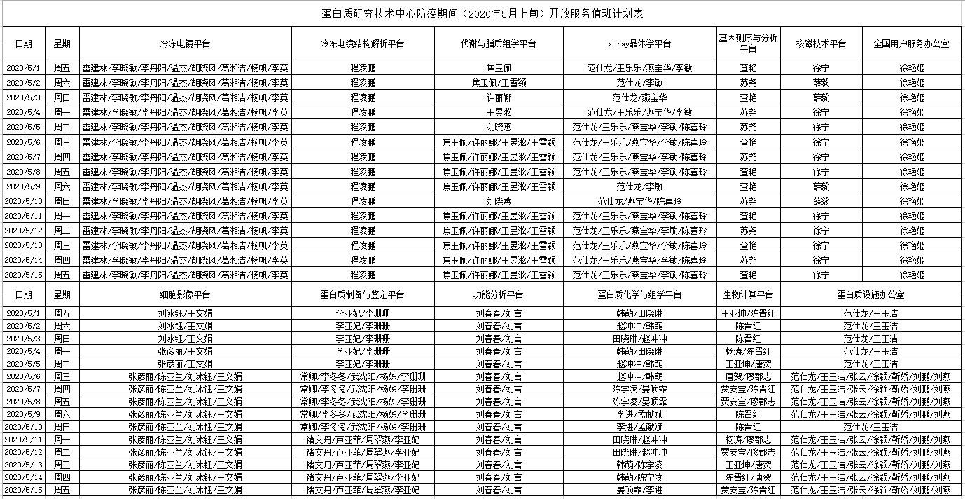 为了保障各实验室科研测试需求,同时响应新型冠状病毒防疫号召,蛋白质研究技术中心所属各个平台5月份将继续安排工作人员到岗值班:
