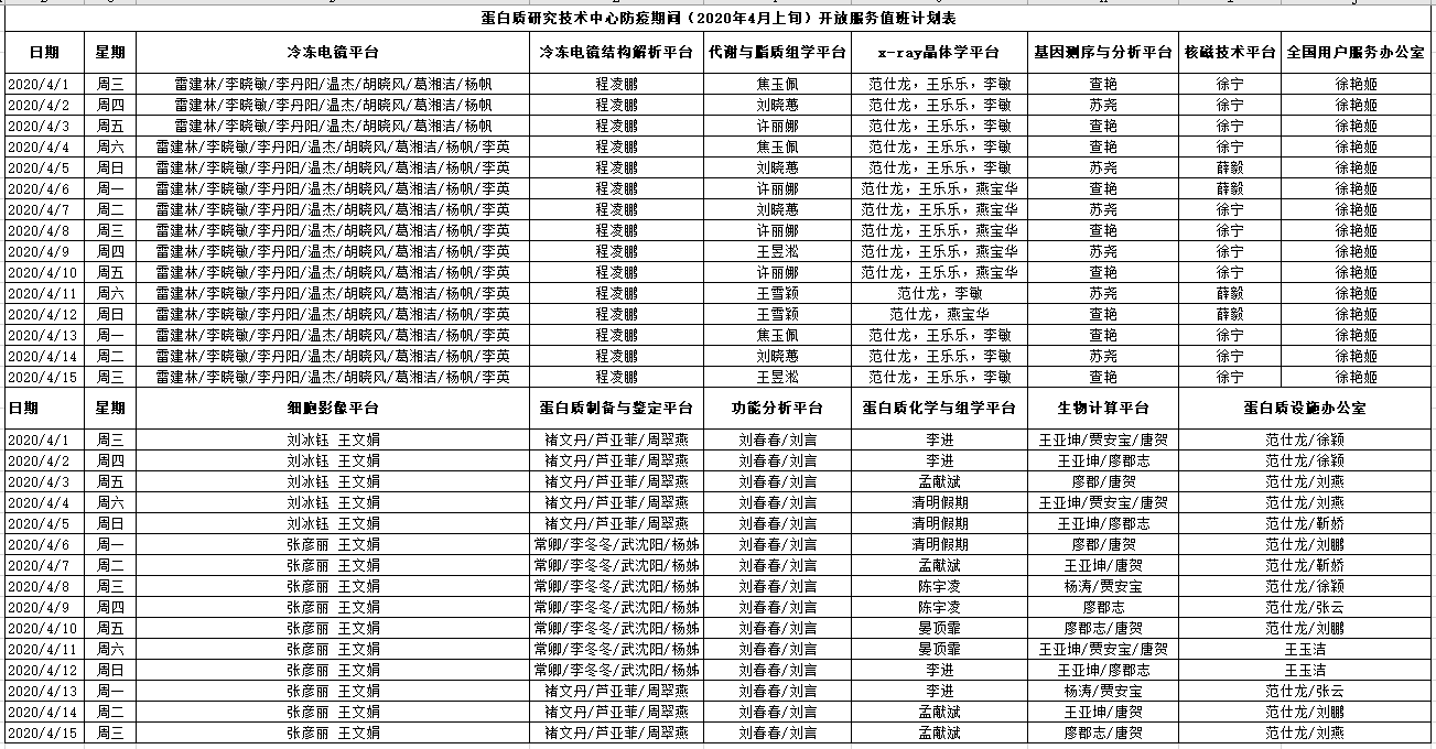 为了保障各实验室科研测试需求,同时响应新型冠状病毒防疫号召,蛋白质研究技术中心所属各个平台/机组4月份将继续安排工作人员到岗值班: