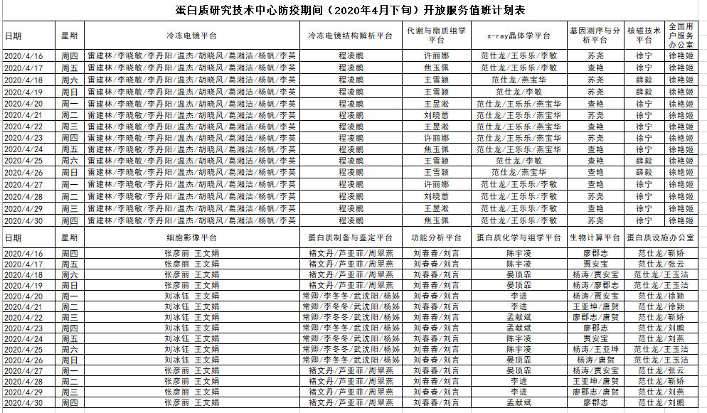 为了保障各实验室科研测试需求,同时响应新型冠状病毒防疫号召,蛋白质研究技术中心所属各个平台4月份将继续安排工作人员到岗值班: