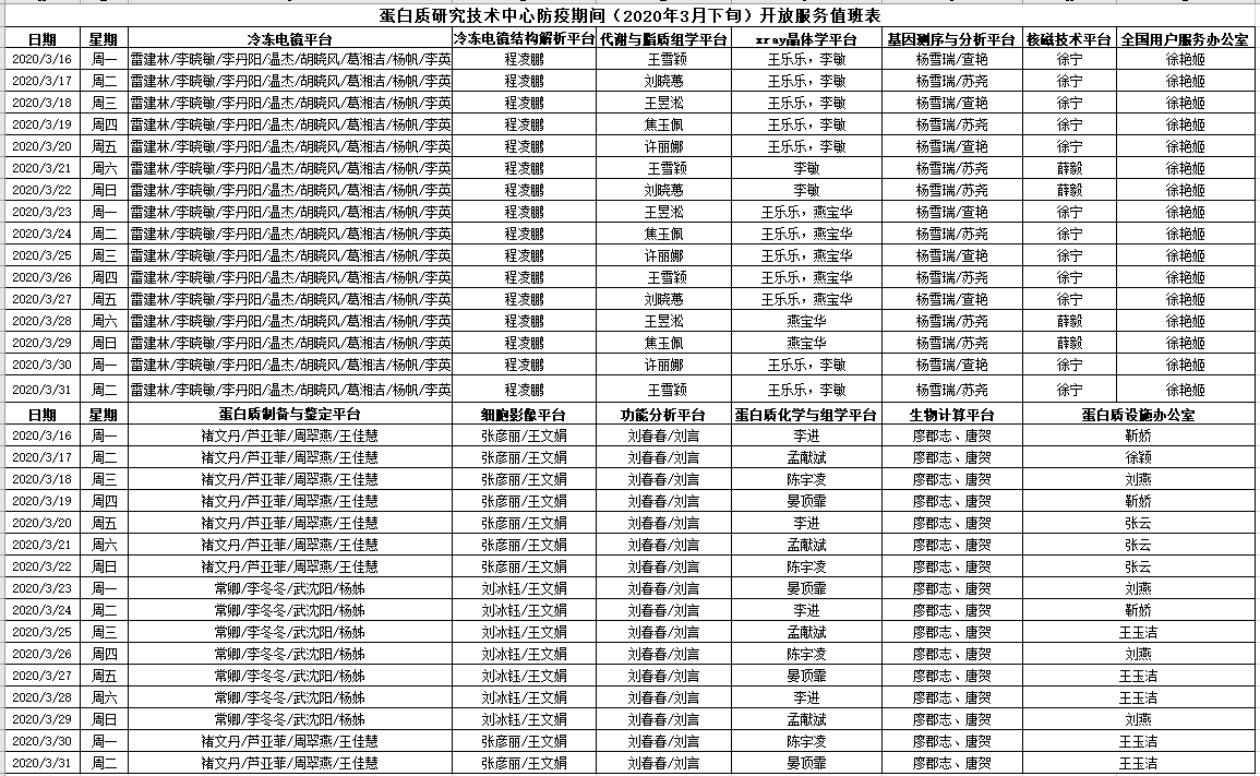 为了保障各实验室科研测试需求,同时响应新型冠状病毒防疫号召,蛋白质研究技术中心所属各个平台/机组3月份将继续安排工作人员到岗值班: