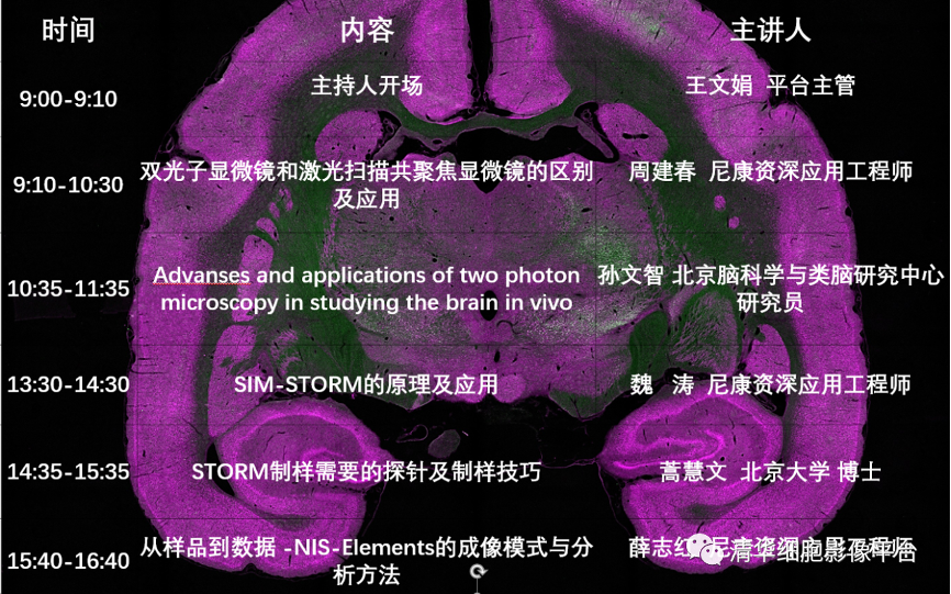 本培训由清华大学生物医学测试中心尼康生物影像中心举办,主要介绍的内容有两方面:一方面介绍平台新安装的A1HD25超分辨率共聚焦显微镜和A1RMP+正置双光子显微镜的配置,同时邀请到了北京脑科学与类脑研究中心的孙文智研究员为我们介绍双光子显微镜在活体脑研究中的应用与进展。另一方面介绍目前越来越普及的超分辨显微镜在生物学中的应用,并且邀请了北京大学biopic专业做超分辨率成像的蒿慧文博士为我们讲解STORM制样的技巧和探针的选择。