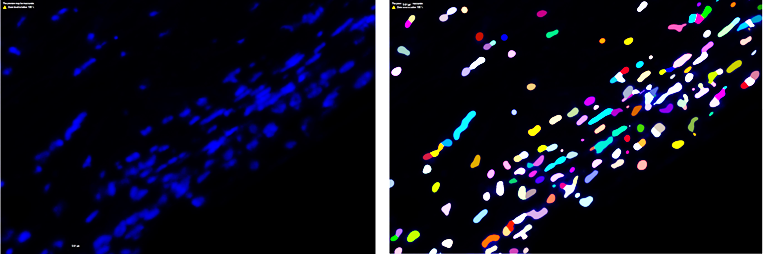 培训内容:图像导入、预处理(去噪)、细胞核识别膨胀、筛选阳性细胞、参数计算。