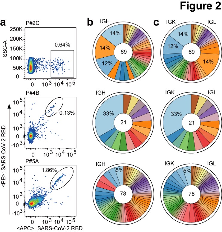 B淋巴细胞是体内产生和分泌抗体的专职细胞,在抗击感染、肿瘤和自身免疫疾病过程中发挥着关键的作用。从数量上看,抗体可以构成血浆总蛋白量的20%左右,并随着血液的流动在全身持续不断的巡视外来入侵的病原体,并对其实施强大的抑制和清除作用。在人体接种疫苗后所诱导产生的保护性免疫反应中,B细胞所产生的针对病原体的抗体,特别是具有中和能力的抗体起着关键性的作用。自2019年底新冠肺炎疫情暴发以来,三个团队便合作展开了针对新冠病毒的单克隆抗体的合作研究。新冠病毒进入细胞依赖于病毒刺突糖蛋白的受体结合区(receptor-binding domain,RBD)与受体ACE2的特异性结合。张林琦和张政团队合作,从8例SARS-CoV-2感染者的单个B淋巴细胞中分离并鉴定出了206个特异性靶向RBD的单克隆抗体,发现这206个单克隆抗体的中和活性与其竞争ACE2结合RBD的能力密切相关,并就一系列高活性中和抗体(P2C-1F11,P2B-2F6、P2C-1A3等)的假病毒和活病毒中和能力进行了深入研究。王新泉团队解析了RBD与抗体P2B-2F6的复合物晶体结构,显示抗体结合产生的空间位阻可以抑制病毒RBD与ACE2的结合,从而阻断病毒的进入。这些发现表明,靶向RBD的中和抗体是针对新冠病毒特异性的抑制剂,具有广阔的临床应用前景。