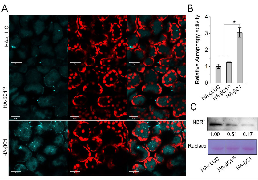 研究报道植物细胞自噬在抗病毒防御中发挥重要的作用。植物-病毒相互作用过程中,病毒会调控(激活/抑制)细胞自噬。至今,那些病毒因子激活自噬以及其分子机制尚未清楚。刘玉乐研究组发现CLCuMuB βC1激活细胞自噬并能够与自噬负调控蛋白NbGAPCs存在相互作用。βC1与NbGAPCs结合并且干扰NbGAPCs-ATG3之间的互作,进而激活自噬,然而不与NbGAPCs互作的βC1突变体(βC13A)不能激活细胞自噬 (见图1)。βC13A的病毒突变体侵染植物后病毒症状增强、病毒 DNA 积累增多,自噬水平降低。该研究报道了第一个激活自噬的植物病毒蛋白,首次揭示了一个植物病原蛋白激活植物细胞自噬的分子机制。