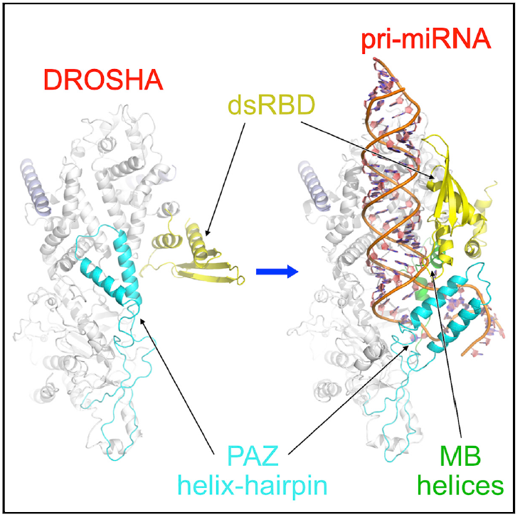 Drosha通过PAZ、MB helix、dsRBD结构域识别pri-miRNA,这些结构域在结合底物前(左)后(右)发生构象变化。