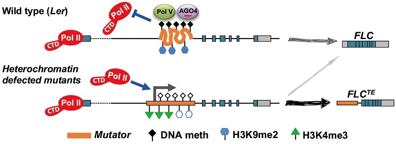 真核生物基因组中的转座子在调控染色质结构、基因表达等方面发挥着重要的作用,但对于基因内含子中的转座子如何调控宿主基因的表达尚不完全清楚。通过正向遗传筛选,孙前文实验室发现当突变拟南芥生态型Ler中的RNA聚合酶(RNA Pol IV和Pol V)后,能引起开花抑制基因FLC 转录起始非正常发生于第一个内含子中的转座子区,导致开花提前。进一步的分析表明,RNA Pol IV和Pol V在FLC第一个内含子中的转座子区建立DNA甲基化及组蛋白H3K9甲基化并形成异染色质区,从而抑制RNA Pol II识别此区域中隐藏的转录起始位点。结合植物全基因组原位延伸转录本测序(pNET-seq, plant native elongating transcript sequencing)结果分析发现,这一现象发生于RNA Pol V所覆盖的50%内含子异染色质中。本研究对理解基因内含子中的异染色质区在调节宿主基因表达以及相关分子机制有重要帮助,拓宽了我们对真核生物基因内部异染色质生物学功能的认识。