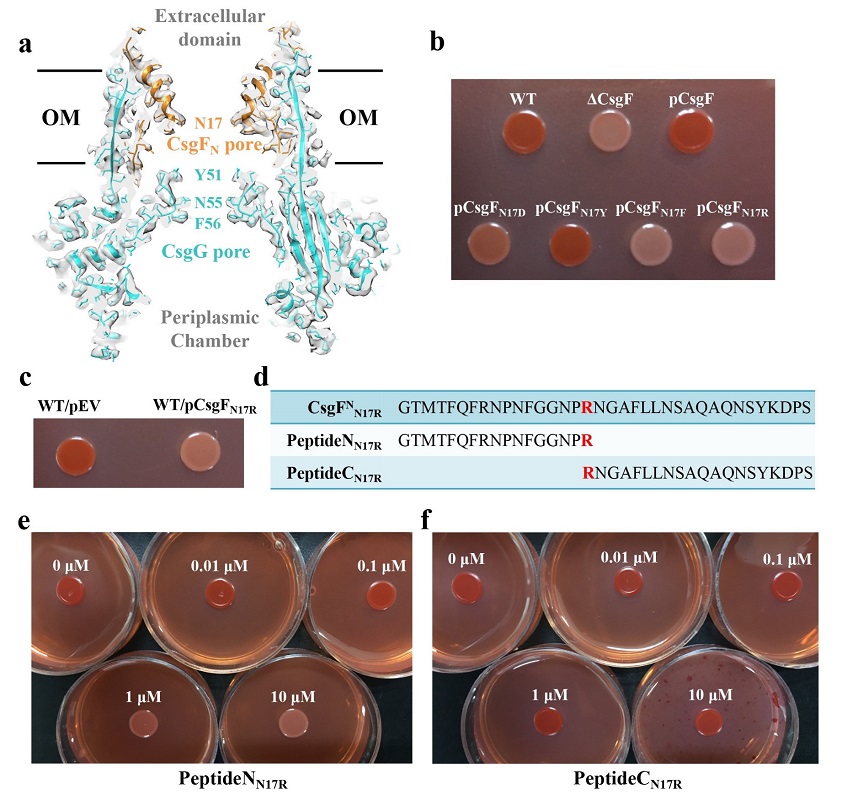 李雪明课题组通过冷冻电镜单颗粒重构的方法解析了大肠杆菌来源的curli生成系统膜上通道复合物CsgFG以及结合了底物的通道符合物CsgFG-CsgAN22的高分辨率结构,分辨率分别达到3.38 A 和3.34 A。CsgFG复合物的结构显示CsgF与CsgG形成9:9结合的双孔道复合物,CsgF的N端(CsgFN)插入到CsgG的b桶内部与CsgG相互作用。体外蛋白结合实验验证CsgFN与CsgG相互作用,CsgF的C端(CsgFC)与CsgB相互作用。进一步的体外蛋白结合实验显示CsgB结合CsgA,CsgF不结合CsgA。综合电镜结构和体外蛋白结合实验结果,我们提出了CsgG-CsgFN-CsgFC-CsgB-CsgA的组装方式,阐明了curli纤维如何结合到细菌表面的机制。此外,通过将CsgF的孔道氨基酸Asn17突变成不同侧链性质的氨基酸,我们发现疏水和带电氨基酸不利于亲水底物的转运,而亲水不带电的氨基酸更有利于底物转运。当把Asn17突变成长链的Arg,缩小了孔道的大小,同样也会影响底物的分泌。基于该实验结果,我们设计了一个多肽抑制剂PeptideNN17R,刚果红实验结果显示该抑制剂具有较强的抑制作用。