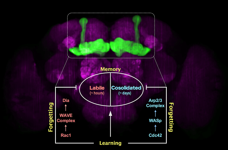 2019年9月 5日,清华大学生命科学学院钟毅课题组在《美国科学院院刊》(PNAS)在线发表了题为“果蝇不稳定记忆和稳定记忆主动遗忘的遗传解析”(Genetic Dissection of Active Forgetting in Labile and Consolidated Memories in Drosophila)的研究论文。该论文首次对果蝇不稳定短记忆和稳定长记忆主动遗忘的下游分子机制进行了系统地比较和解析,发现不稳定短记忆的主动遗忘由Rac1/WAVE complex/ Dia通路介导,而稳定长记忆的主动遗忘通过Cdc42/WASp/ Arp2/3 complex通路介导。由于Dia和Arp2/3 complex被报道分别调控神经元微丝骨架线性生长和分支生长,这使得本论文研究成果提供了一个有趣的可能性:稳定性不同的记忆组分的主动遗忘可能与神经元不同形式的微丝结构的生长方式有关。
