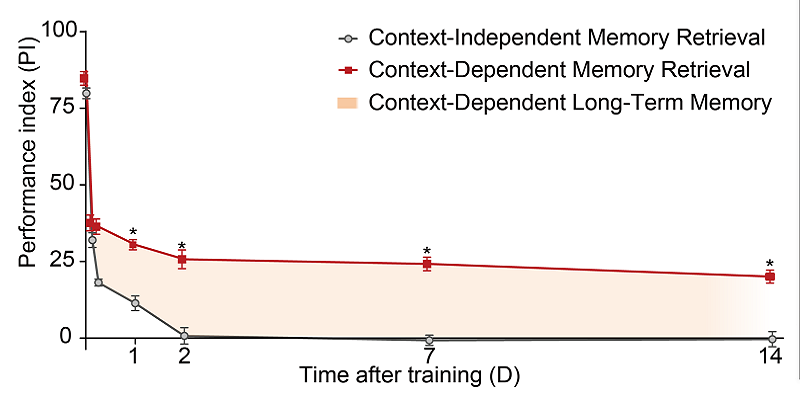 在整个学习记忆研究领域的一个常识是长时程记忆的形成需要一个维持数小时的、需要新蛋白质合成的记忆固化过程。在果蝇嗅觉惩罚性记忆中,长时程记忆的形成更是需要重复十次、每次的时间间隔在15分钟的学习过程。这种训练下形成的长时程记忆需要数小时的时间来进行固化,维持7天以上。而简单的一次训练则只能形成相对不稳定的记忆,并在24小时之内几乎完全被遗忘掉。今日钟毅课题组发表的论文则发现了一种长期维持的情境依赖记忆(cLTM, context-dependent long-term memory)。研究人员发现,在果蝇中简单地一次训练就能够马上形成这种记忆,不需要固化过程却能够维持超过14天而不衰减。