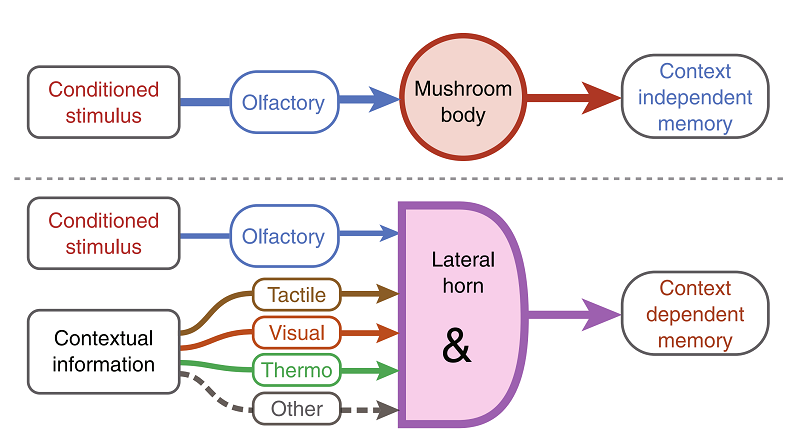 令人出乎意料的是,这种记忆的维持不仅不需要新蛋白质合成,还不依赖于经典的果蝇嗅觉学习记忆中枢:磨菇体(MB, mushroom body),而是依赖于另一个嗅觉高级中枢侧角(LH, lateral horn)。侧角通常被认为是负责嗅觉相关的先天行为,它会与多个脑区连接。在这里,研究人员发现情境依赖记忆的提取需要环境中多种感官信息的匹配,如训练环境与测试环境的光线环境、温度、触觉信息等等。在记忆提取时,这些信息会整合到侧角,共同调控情境依赖的嗅觉记忆提取。这些研究成果揭示了心理学中情境效应的神经机制,并且这种长期维持却又不依赖于固化的记忆形式启发我们重新理解学习与记忆的本质。