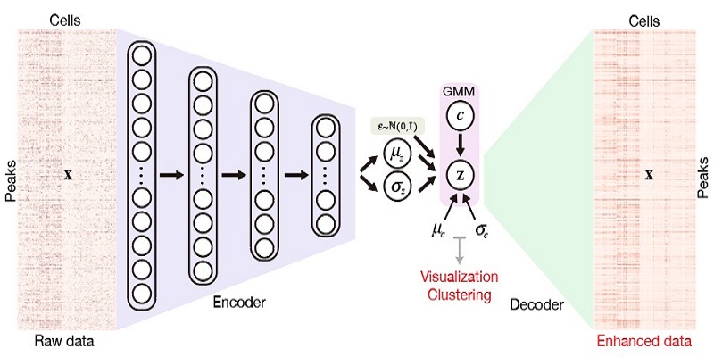 近日,张强锋课题组发表的文章提出了SCALE,利用人工智能深度学习的方法,结合变分自编码器和高斯混合模型,提取单细胞ATAC-seq数据的隐层特征,将问题从复杂稀疏的高维度的染色质开放图谱空间投射到了简单抽象的低纬度特征空间。这种处理不但可以发现和解析细胞特异性的染色质图谱模式,还通过相似细胞信息共享,填补了技术限制导致的缺失值,从而巧妙地解决了单细胞ATAC-seq数据中高维度、稀疏性、二值化等问题。SCALE提供了完整的可视化、聚类、数据增强、帮助下游生物信息的挖掘,为研究者们解码单细胞表观遗传学提供了有力的工具。