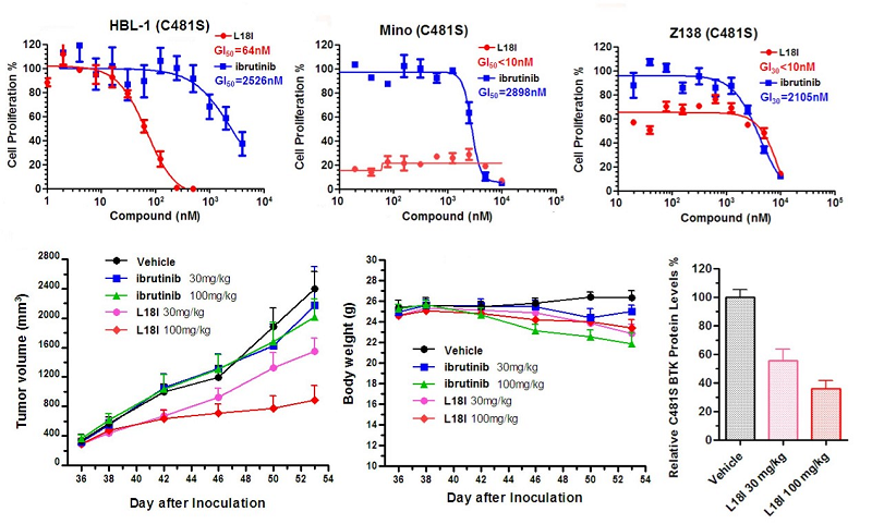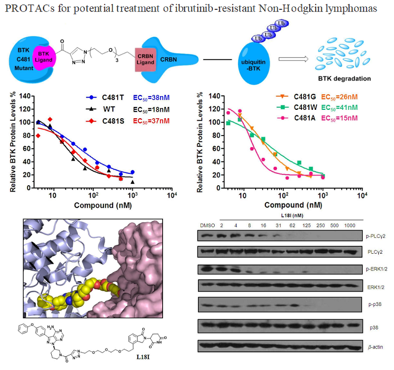 2019年3月19日,清华大学药学院饶燏课题组、北京大学肿瘤医院朱军课题组、清华大学生命学院和免疫学研究所刘万里课题组,携手合作在血液学领域顶级期刊《白血病》(Leukemia)杂志发表研究论文,介绍《PROTAC技术通过降解多种突变型BTK蛋白可作为伊布替尼耐药的非霍奇金淋巴瘤的潜在治疗策略》(Degradation of Bruton’s tyrosine kinase mutants by PROTACs for potential treatment of ibrutinib-resistant Non-Hodgkin lymphomas)。该论文通过构建基于PROTAC技术的新型高溶解度的BTK蛋白降解剂,成功高效的降解多种临床相关的突变型BTK蛋白。并进一步在荷瘤小鼠模型体内证明了该治疗策略的有效性,为临床上克服BTK蛋白突变所引起的伊布替尼(Ibrutinib)耐药问题提供了新方向。