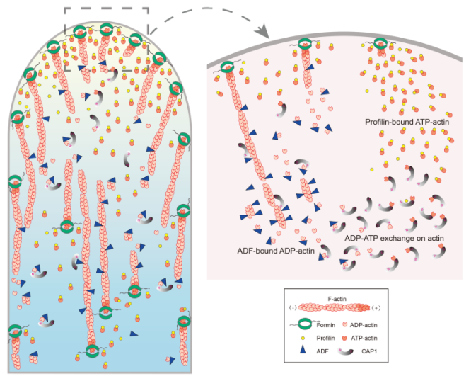 黄善金课题组后续的研究证明,微丝从花粉管顶端质膜的聚合主要是由formin/profilin元件所控制(Mol Plant, 2015; PLoS Genet., 2018)。由于推测花粉管中G-actin主要以G-actin-profilin复合体的形式存在,产生和维持一个可聚合的ATP-G-actin-profilin复合体库是花粉管顶端微丝聚合调控模型中的关键步骤。相比动物profilins能够促进G-actin的核苷酸交换,植物profilins缺乏或抑制G-actin的核苷酸交换,解聚的ADP-G-actin必须先转换成ATP-G-actin然后再转交给profilin形成ATP-G-actin-profilin复合体才能重新进入微丝聚合循环。另外,由于微丝解聚因子(actin-depolymerizing factor; ADF)是花粉管微丝骨架动态转换的关键因子(Plant Cell, 2013; J Cell Sci., 2017),解聚的G-actin应该主要以ADP-G-actin-ADF复合体的形式存在。由于ADF偏好结合ADP-G-actin并抑制其核苷酸交换,如何使ADP-G-actin和ADF解离并使其转化为ATP-G-actin至关重要。