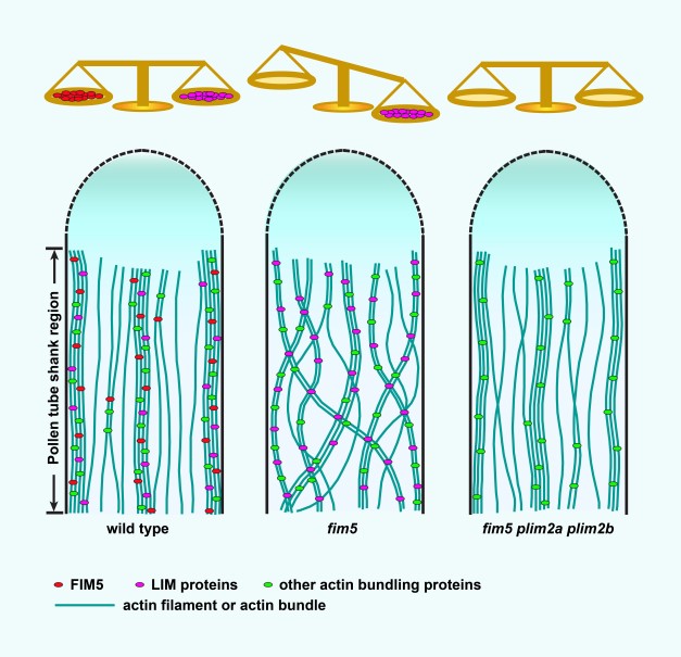 花粉管生长为两个不能运动的精细胞提供运输载体,最后将精细胞送到胚珠完成开花植物的双受精过程。花粉管生长非常快速,探讨花粉管生长调控机制一直是植物生殖生物学和细胞生物学领域重要的科学问题。与花粉管快速生长相匹配的是花粉管中存在着旺盛的由微丝骨架系统驱动的细胞质环流现象。目前对于花粉管胞质环流现象的认识如下:即一些囊泡或细胞器以微丝骨架为轨道在花粉管中产生运动。在这个理论框架中,产生和维持有序的微丝结构是推动胞质环流的基础。花粉管如何控制这些有序微丝结构的产生得到了人们的广泛关注,大部分的研究集中在解析某一个或某一类微丝成束因子的功能和作用机制上,对于不同类微丝成束因子如何协作调控花粉管微丝结构几乎一无所知。