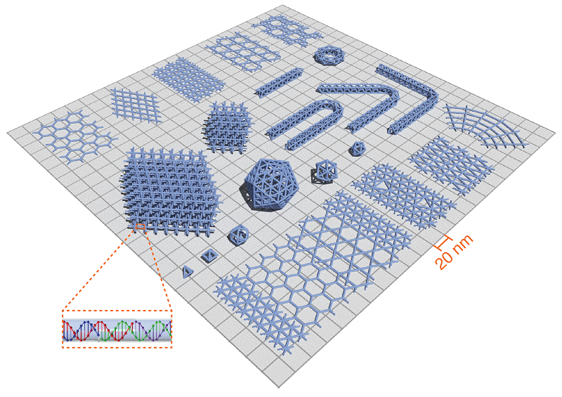 因为具有可编码性,DNA 的自组装已经成为一种构建复杂纳米结构和器件的有效方法。在DNA纳米技术的最初阶段,简单的几何体或者二维晶体可以被分支分子(branched molecules)作为结构模块成功构建。经过三十多年的发展,通过DNA折纸(scaffolded origami)和DNA单链模块(single-stranded tiles/bricks)等方法,DNA纳米结构的复杂性和结构大小都得到了飞跃性提升,而最初用简单分支分子作为模块的构建方式逐渐淡出大家的视线。