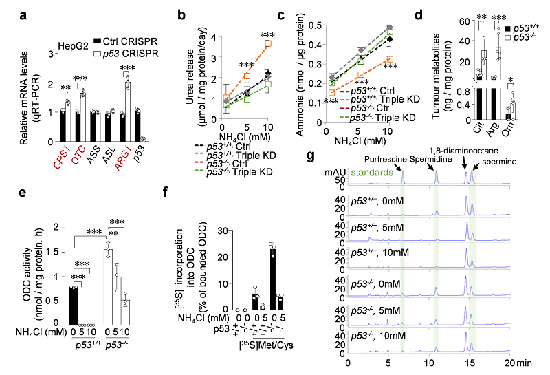 图1. (a,b),p53调控尿素循环代谢酶基因表达(a),和尿素释放(b)。(c-g),p53通过尿素循环调控了氨的生成(c),肿瘤生成(d),细胞内ODC的酶活性(e),ODC蛋白翻译(f)和多胺合成(g)。