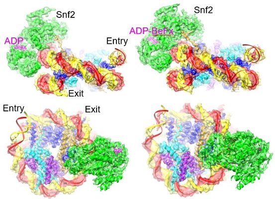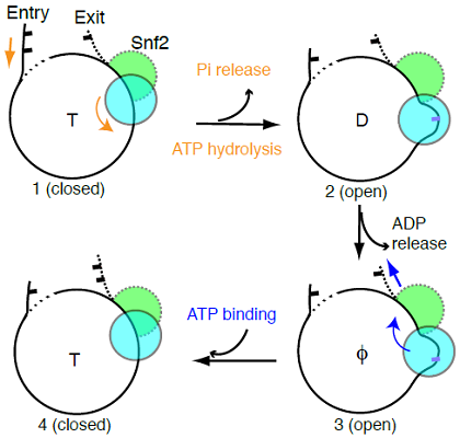 SWI/SNF家族蛋白利用ATP水解产生的能量移动核小体在基因组DNA的位置,重塑染色质。这对于控制遗传物质的开放性,调节基因转录等方面发挥重要作用。陈柱成实验室近期报道了Snf2与核小体结合的结构 (Liu, Nature 2017)。但这个早期的工作并没有明确检测到DNA移位。 染色质重塑蛋白如何利用ATP水解的能量推动核小体滑移依然是一个让人困扰的难题。