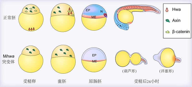 图1 Huluwa(Hwa)在斑马鱼胚胎中的作用模式。在野生型受精卵中,hwa mRNA定位在营养极,而Axin和b-catenin蛋白定位在动物极胞质中。在囊胚阶段,Hwa蛋白定位在未来背部区细胞的质膜上,促进Axin降解,胞质中的b-catenin转运到细胞核中,从而在原肠胚形成组织中心,组织中心的信号网络再决定背腹和前后轴线的细胞命运分化及细胞的运动方向,因而正常发育并产生正常的形态。在hwa母源突变体(Mhwa)中,因缺失卵源hwa mRNA,囊胚背部细胞中的Axin不受降解,从而引起b-catenin降解、组织中心不能形成,24小时时的胚胎为没有头部和躯干的葫芦形或洋葱形。O,组织中心;N,神经外胚层;EP,表皮外胚层;ME,中内胚层。