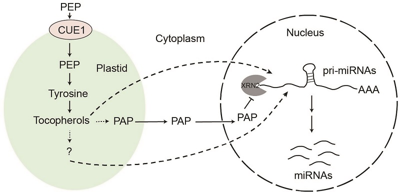 在这项研究中,研究者通过正向遗传筛选获得到了一个严重影响miRNA产生的突变体cue1. CUE1是一个定位于叶绿体内膜的转运蛋白,它可以将化合物PEP转运至叶绿体内并通过Shikimate 通路代谢产生三种芳香族氨基酸 (Tyr, Phe, and Trp)。遗传学分析表明,三种芳香族氨基酸中的Tyr,而不是Phe和Trp,为miRNA的积累所必需。进一步分析发现,Tyr通过生成下游代谢产物维生素E调控miRNA生成。戚益军研究组随后深入研究了维生素E 调控miRNA生成的作用机制,发现维生素E可通过叶绿体逆行信号分子PAP,抑制核内RNA外切酶XRN2的活性,使得pri-miRNA 免于降解,从而促进miRNA的生成。此外,该研究还发现miRNA通路的逆行信号调控模式对于拟南芥热胁迫下耐热性的获得具有重要意义。