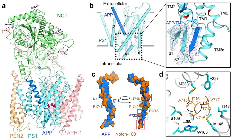 图2:γ-分泌酶结合APP复合物的冷冻电镜结构。a. γ-分泌酶结合APP复合物结构模型;b. PS1与底物APP所形成的β折叠片结构,其中一个来源于底物,另外两个片层来源于PS1;c. APP与Notch跨膜区结合γ-分泌酶状态下表面特征比较,可以观察到两种底物的具体区别;d. APP与γ-分泌酶催化亚基PS1跨膜区中部分与阿尔兹海默症相关突变分布。
