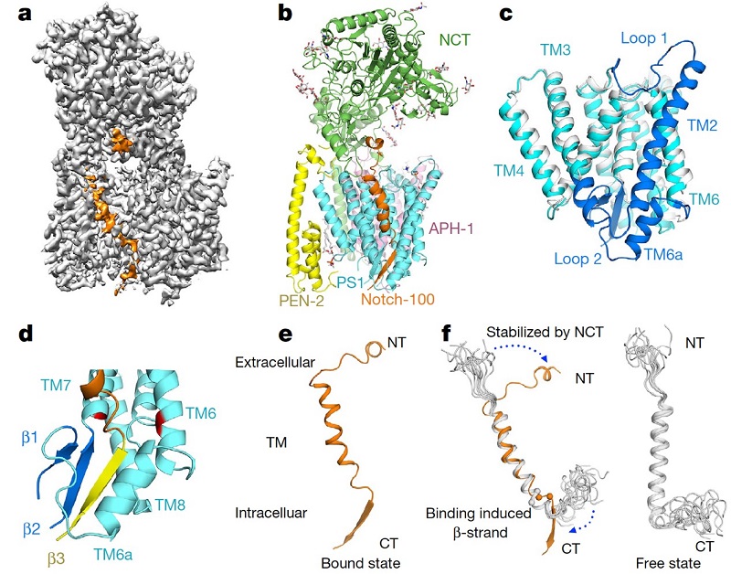 图1: γ-分泌酶结合Notch复合物的冷冻电镜结构。a. γ-分泌酶结合Notch复合物的密度图。其中橙色标记的为结合的Notch;b. γ-分泌酶结合Notch复合物结构模型;c. 底物结合与不结合状态下催化亚基PS1的结构比较,灰白色为未结合底物的状态,青色和蓝色为结合底物的状态,蓝色部分为发生变化的主要区域; d. PS1与底物跨膜区靠近细胞膜一侧形成β折叠片,从而稳定结合底物;e-f. 与γ-分泌酶结合后底物Notch发生的构象变化。橙色为结合在γ-分泌酶中的Notch构象,灰白色为未结合的构象。