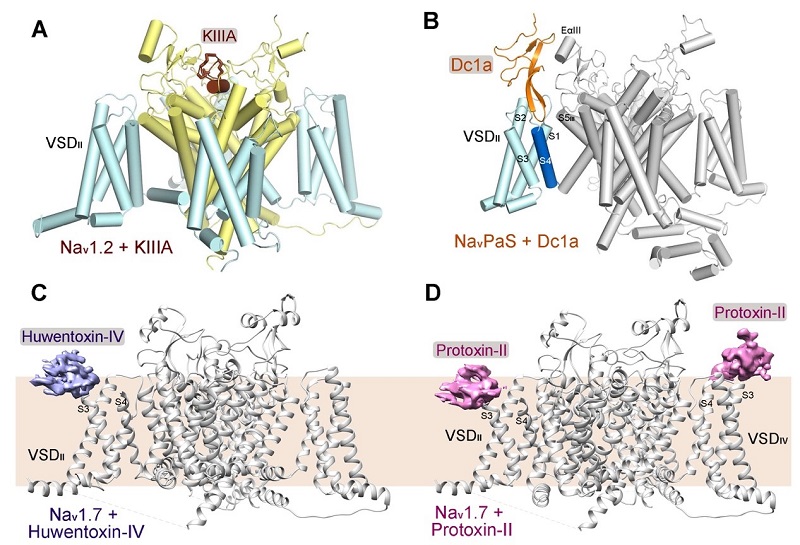 (A)Nav1.2与特异性毒素KIIIA的复合物结构;(B)NavPaS与Dc1a的复合物结构;(C)Nav1.7与特异性毒素Huwentoxin-IV的复合物结构;(D)Nav1.7与特异性毒素ProTx-II的复合物结构。