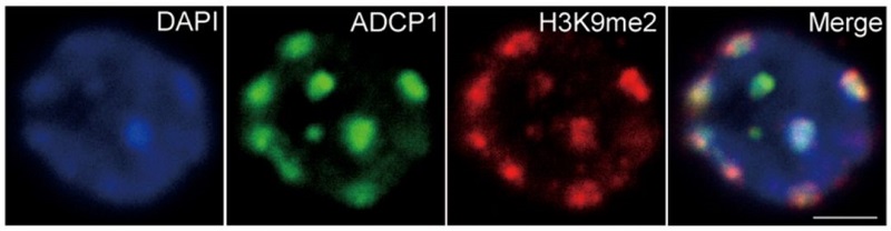 在接下来的工作中,研究人员用免疫荧光染色和ChIP-seq实验在植物体内证实了ADCP1与异染色质H3K9me2共定位(图2)。ADCP1富集在着丝粒旁区异染色质及常染色体臂的异染色质补丁区等,偏好富集于较长的转座子(>4kb),尤其是Gypsy LTR逆转座子等。随后,通过观察adcp1突变体以及瞬时超表达ADCP1到原生质体的细胞核染色中心(chromocenter)凝聚状态,研究人员发现ADCP1对异染色质染色中心的形成至关重要,它的缺失或者过量表达都会造成染色中心的解聚或弥散,且该过程依赖于对H3K9me2的识别。进一步的研究发现adcp1突变体中H3K9me2以及CHG/CHH甲基化水平显著下降,并且激活了一些转座子的表达。综上所述,研究人员在拟南芥中的功能研究表明ADCP1是一类重要的植物HP1家族成员,对于异染色质形成、H3K9me2和CHG/CHH甲基化维持,以及转座子沉默是必不可少的。
