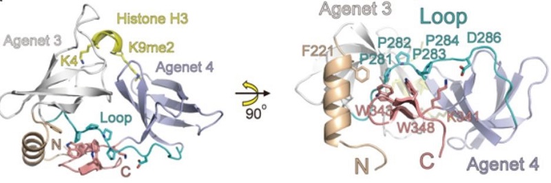 图1,ADCP1串联Agenet结构域呈现出一种独特的整体折叠和多肽识别模式