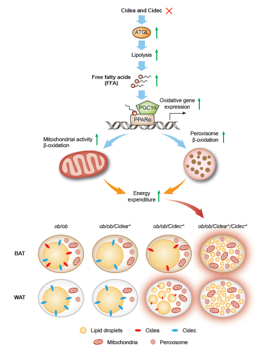 进一步分子机制分析,Cidea和Cidec的缺失导致脂肪降解酶ATGL活性上升、游离脂肪酸增多,游离脂肪酸作为配体激活PPARα及其下游的过氧化物酶体和线粒体通路,导致脂肪消耗增加。