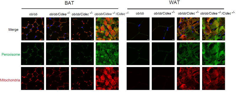 图1:Cidea和Cidec的缺失导致线粒体和过氧化物酶体增加。