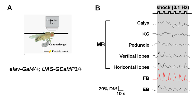 果蝇也存在着这两种逃避。前人在果蝇上对于这个主题的研究主要聚焦在外周神经系统,而对于中枢神经系统如何处理伤害感受信息并指导逃避行为了解甚少。本文作者搭建了基于双光子显微镜的自动刺激、活体钙成像记录装置,将活着的带有钙离子指示蛋白GCaMP3的转基因果蝇后脑开个小窗,记录其对于伤害性电刺激的反应。结果显示位于大脑中间位置的扇形体(Fan-shaped Body,FB)对伤害刺激响应极为强烈。扇形体是一个复杂的多层结构,作者利用多个标记扇形体不同层的品系进一步实验发现,扇形体的不同层对伤害刺激的响应也不相同,腹侧层的响应要远远高于背侧层。