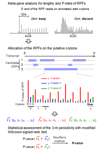 杨雪瑞课题组的一个重要研究方向为使用ribosome profiling技术系统分析肿瘤、发育等复杂生物学过程中的翻译调控机制,并同时进行相关实验技术及数据分析方法的开发。Ribosome profiling通过对核糖体保护的RNA片段(ribosome protected fragment,RPF)的深度测序分析,提出基因组范围的翻译状态图谱。翻译过程中,核糖体相对于RNA以密码子长度(3 nt)为单位移动。因此,以P-位点为基准,来源于正常翻译过程的RPF片段应该在RNA上呈现3碱基的周期性分布。这是判断一个RNA是否被翻译的直接证据。但是,ribosome profiling数据远非如此理想,多种因素都可能干扰对翻译的判断,例如RPF总体分布不均匀、覆盖率低、ORF长度差异大、P-位点判断误差、测序误差、RNA片段污染等等。因此,从核糖体分析数据中准确鉴定具有翻译活性的ORF需要高敏感、高准确度的方法流程。