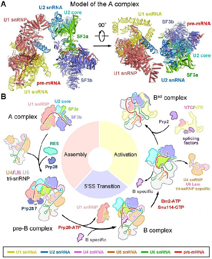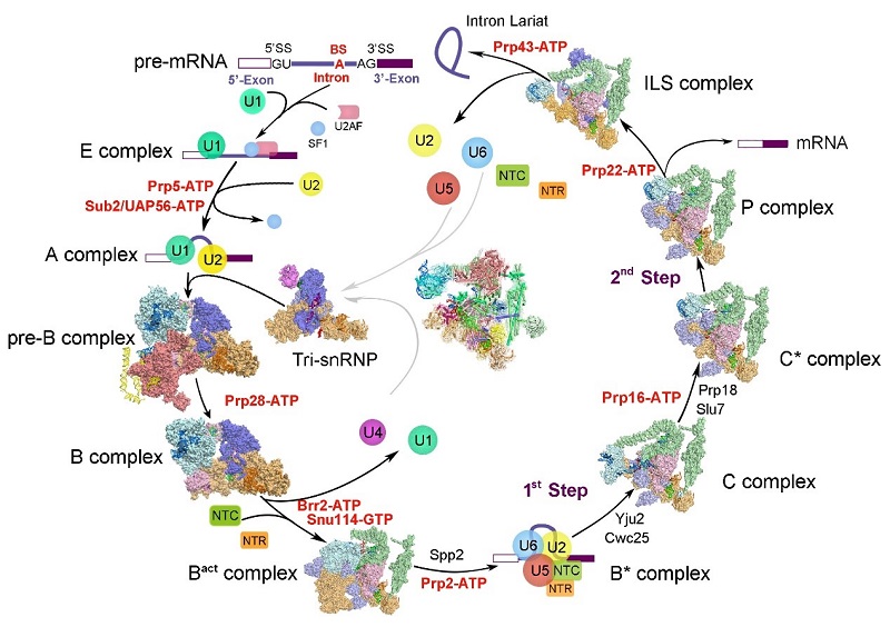RNA剪接是真核生物基因表达调控的重要环节之一。上世纪70年代,科学家们首次发现真核生物基因的不连续性,从而表明遗传信息从DNA转移到RNA上之后,需要经历有效遗传信息的“剪断”与重新“拼接”,这种有效遗传信息的拼接与“无效”遗传信息的去除,被称为RNA剪接。RNA剪接普遍存在于真核生物中,随着物种的进化,含有内含子的基因数量增加,发生RNA剪接的频率也相应增高,使得一个基因编码多个蛋白质成为可能。RNA剪接的本质是两步转酯反应,这种看似简单的化学反应在细胞中难以自行发生,而负责执行这一化学反应的是细胞核内一个巨大且高度动态变化的分子机器——剪接体(spliceosome)。在剪接反应过程中,多种蛋白质-核酸复合物及剪接因子按照高度精确的顺序发生结合和解聚,依次形成预组装复合物U4/U6.U5 Tri-snRNP(U4/U6.U5三小核核糖核蛋白复合物)以及至少8个状态的剪接体pre-B、B、Bact、B*、C、C*、P以及ILS复合物。