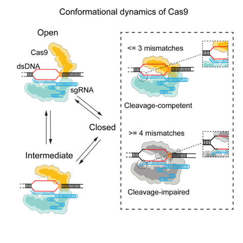 单分子荧光共振能量转移技术(FRET)是检测生物大分子构象变化的有利工具。该研究通过在Cas9蛋白的特异位点上标记荧光团,基于全内反射荧光显微镜快速灵敏地捕捉单个Cas9分子的FRET效率变化以及在每个FRET状态的停留时间,以此反应Cas9的构象变化,并提供该过程中的一系列动力学参数。该研究发现,Cas9展现出三种构象状态,并可以自发的在这三种状态中自由切换。靶标序列的PAM远端与sgRNA的大于三个碱基的错配,导致Cas9的HNH结构域(核酸切割结构域)稍偏离了其正确切割位点,因而将其从切割活性态转化为非活性状态。而这种对错配的校验机制是Cas9蛋白与PAM远端DNA/RNA双链相互作用对其HNH结构域的长程别构调控来实现的。