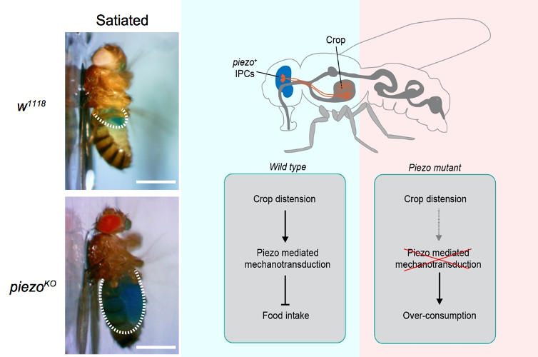 进食是一种非常复杂而又受到精细调控的行为。消化道时刻处于动态调节过程,人体可以“感受”到消化道不同部位的机械信息,并对这些信息做出及时的反应。例如,当进食到一定阶段时,最先感受到由机械敏感神经元带来的饱胀感;而长时间未进食时,由于肠胃排空所激发的机械信息会带来迅速的饥饿感。然而,这些感受背后的神经机制尚不清楚。该研究发现,机械敏感离子通道基因piezo的突变(piezoKO)会显著影响果蝇的进食行为。与野生型相比,piezoKO果蝇会过量进食或者饮水,部分果蝇甚至会一直进食至嗉囊(功能与哺乳动物的胃相似)被胀破。作者进一步鉴定出大脑中一群表达piezo的神经元,它们在果蝇嗉囊壁上形成丰富的树突结构,可以被嗉囊的胀大引起的张力激活,从而在进食过程中实时检测嗉囊的体积变化;失活这些神经元会导致进度进食,而激活它们可以抑制进食。作者还发现,小鼠的Piezo1蛋白可以挽救果蝇piezo基因缺失导致的过量进食表型,提示机械力调节进食这一功能在进化上可能是保守的。