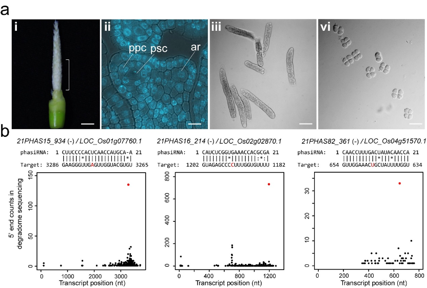 图注:a,处于不同发育时期的水稻雄性生殖细胞。i,减数分裂前的穗,标尺=0.2 cm;ii,经DAPI染色的减数分裂前花药横切面,标尺=30 μm;iii, 减数分裂I早前期的虫状细胞,标尺=50 μm; iv, 四分体,标尺=50 μm。b,用低起始量降解组测序鉴定水稻雄性生殖细胞中21-nt phasiRNA的作用靶标(3个例子)。