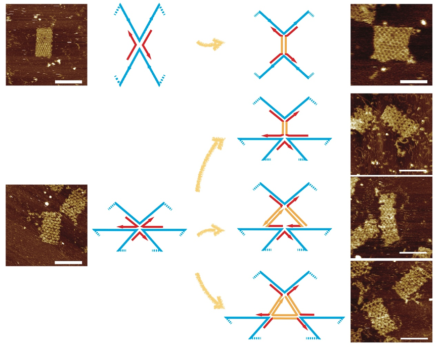无骨架分子“乐高”模块(橙色)可以多种方式整合入框架型DNA结构的折纸骨架模块(红色)从而设计和构建复合型核酸纳米结构。原子力显微镜照片附于相应示意图旁。