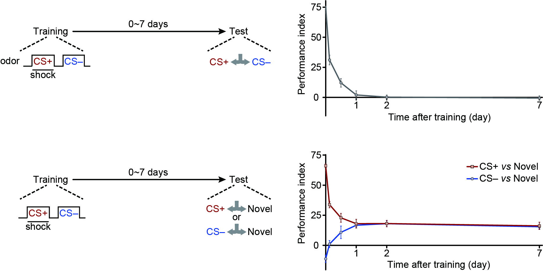 为了衡量果蝇在训练后对于CS+和CS−的趋向性是否发生了改变,研究者们重新设计了记忆的测量方法。取而代之的是,训练后的果蝇在CS+与新气味之间进行选择,以及在CS−与新气味之间进行选择。这样,原本仅能维持1天的记忆曲线被拆分为了两条分别对于CS+和CS−的逃避曲线。出乎意料的是,训练后的果蝇对CS+与CS−呈现出了两条几乎对称的逃避曲线:果蝇对于CS+在训练结束初期的逃避程度很高,不过随之在1天内快速下降;然而,它们在训练结束后最初表现为对CS−的喜欢,然而随着时间过去喜欢变成了逃避。并且最终,在训练结束后的1天内,两条逃避曲线逐渐融合,果蝇最终呈现出了对CS+和CS−相同程度的逃避,并且这种逃避可以维持超过7天。也正是由于果蝇对CS+和CS−有着同等程度的厌恶,使得它们无法在二者之间做出选择。