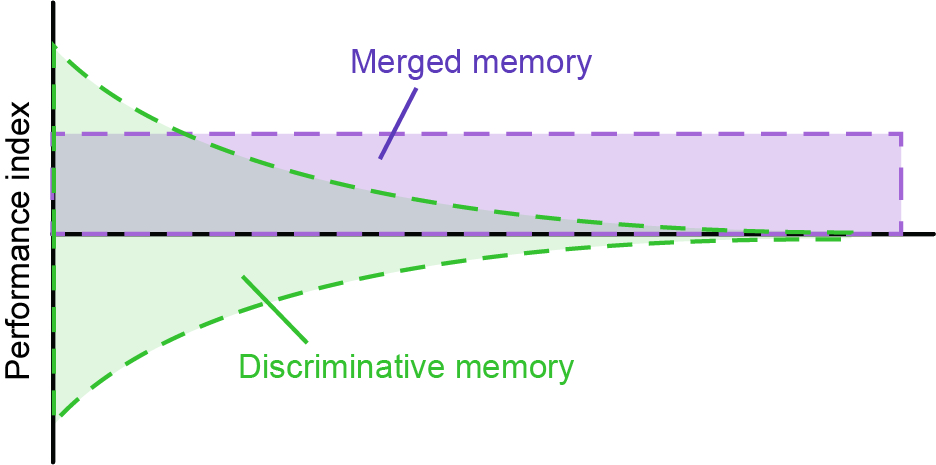 这样,在刚刚经历过危险事件后不久,动物的行为主要由短期维持的辨别记忆(discriminative memory)来主导,从而促使动物对于危险信号与安全信号来进行区分;而在经历过危险事件很久以后,动物则会选择一种基于融合记忆的更加保守的生存策略:它们对所有曾经出现在危险事件当中的感觉信息都进行逃避,从而避免自然界中潜在的危险。