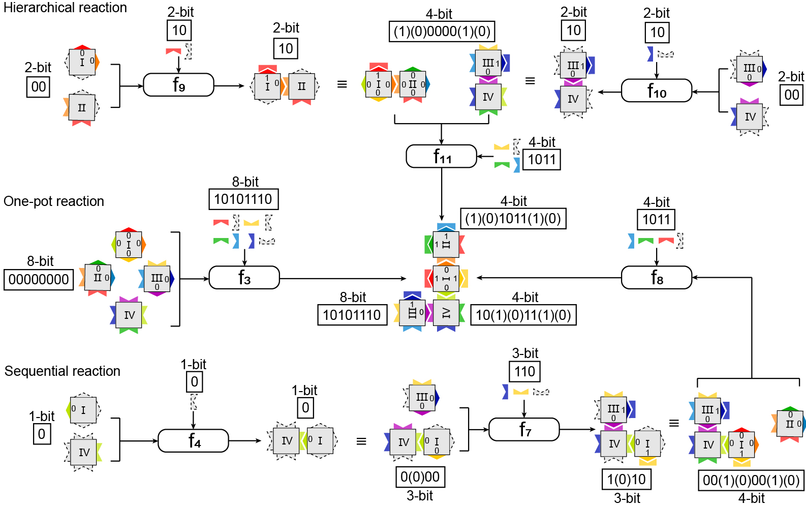 图2 基于非黏性末端链置换方法控制信息计算过程。采用三种不同方式反应可以得到相同的J型四聚体俄罗斯方块。第一种是层级式反应(顶部)。两两单元之间形成二聚体,然后再形成四聚体,即两个2比特输入/2比特输出的布尔函数通过组合得到一个4比特输入/2比特输出的函数。第二中是一步法反应(中间),操作与图1所示相同,是一个16比特输入/8比特函数输出的布尔函数。第三种是顺序反应(底部),单元之间依次连接形成四聚体,是三个2比特输入/2比特输出布尔函数之间的迭代。