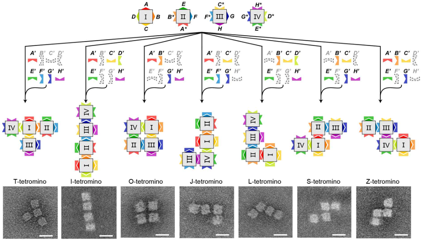图1 基于非黏性末端链置换方法的三维DNA长方体纳米结构单元形成不同的四聚体复合体的操作和结果。四种三维长方体DNA纳米结构单元的四个侧面分别相互配对(相互匹配的颜色的凹凸面代表可以配对的侧面和可配对的封闭链)。当特定的封闭链集合(用彩色表示使用的封闭链,用灰色表示未采用的封闭链)加入到相同的四种单元混合体系中,能够控制形成七种俄罗斯方块中的一种。最下排为电子显微镜成像结果,比例尺:25纳米。