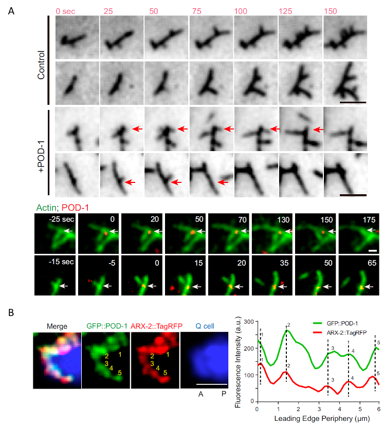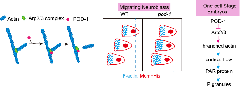 欧光朔实验室通过体外的微丝聚合实验发现POD-1能够使Arp2/3介导生成的微丝网络去分支,对内源性POD-1蛋白的荧光实时成像分析结果表明 POD-1与迁移的神经前体细胞前缘的Arp2/3共定位(图1),发现POD-1在神经前体细胞中的条件性敲除导致了细胞内微丝组装、细胞极性和细胞迁移的缺陷;而POD-1在线虫早期胚胎内的敲低阻断了Arp2/3的运动,并影响了极化的皮质流(cortical flow),最终导致细胞命运决定因子的对称分离。这些结果表明,在迁移的神经前体细胞和不对称分裂的胚胎中,细胞通过微丝去分支来组织微丝网络和细胞极性(图2)。