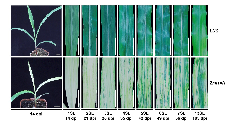 刘玉乐实验室以两种侵染玉米的黄瓜花叶病毒(CMV)为基础,通过体外假重组及构建嵌合体病毒,首先获得了一种假重组嵌合CMV(Pr CMV),该病毒既可高效侵染玉米植株又不造成严重的病症,进而用于VIGS载体的开发。利用Pr CMV介导的VIGS系统,成功下调玉米IspH基因表达(图1)。病毒接种第5天,即可观察到明显的基因沉默表型;基因沉默可持续整个玉米生长周期(大于105天)。该玉米VIGS系统操作方法简单,不依赖于专门设备,在植株内可快速且高效地实现目的基因的沉默,且基因沉默持续时间长,适用于玉米整个生长周期内基因功能的研究。此外,利用不依赖于连接酶的克隆技术(LIC)改造的该 VIGS系统,极大地降低了基因克隆的时间和成本,可大规模进行植物基因功能组学研究。该研究第一次同时利用假重组和构建嵌合体的方法进行VIGS系统的开发,为之后VIGS技术的发展提供了一种新策略。
