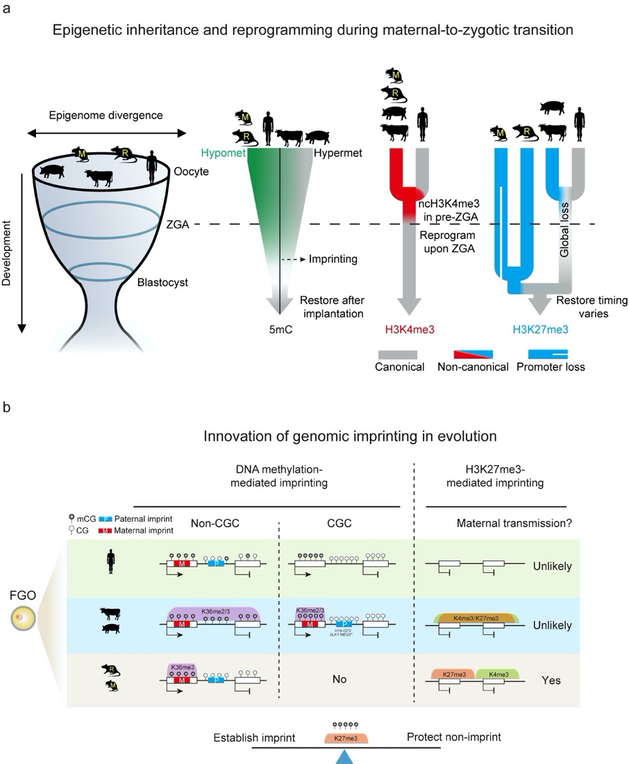 在生命起始的时候,高度特化的精子和卵子结合形成全能性的受精卵。在这一过程中,表观遗传信息发生了广泛而剧烈的重编程。同时,一些表观遗传信息如基因印记会被选择性的保留下来。由于哺乳动物配子和早期胚胎材料的稀缺,关于表观遗传信息在配子向胚胎转变(parental-to-embryonic transition)过程中是如何遗传和重编程的研究长期进展缓慢。近年来,由于一些高灵敏微量细胞染色质分析技术的出现,研究人员得以在分子水平研究表观遗传信息在生命起始过程中是如何擦除、重建和遗传的。这些研究大部分是在模式动物尤其是小鼠中展开的。但是,在不同物种中,表观遗传信息的传递是否保守,以及不同物种中是否存在普适的表观遗传调控规律调控胚胎发育并不清楚。