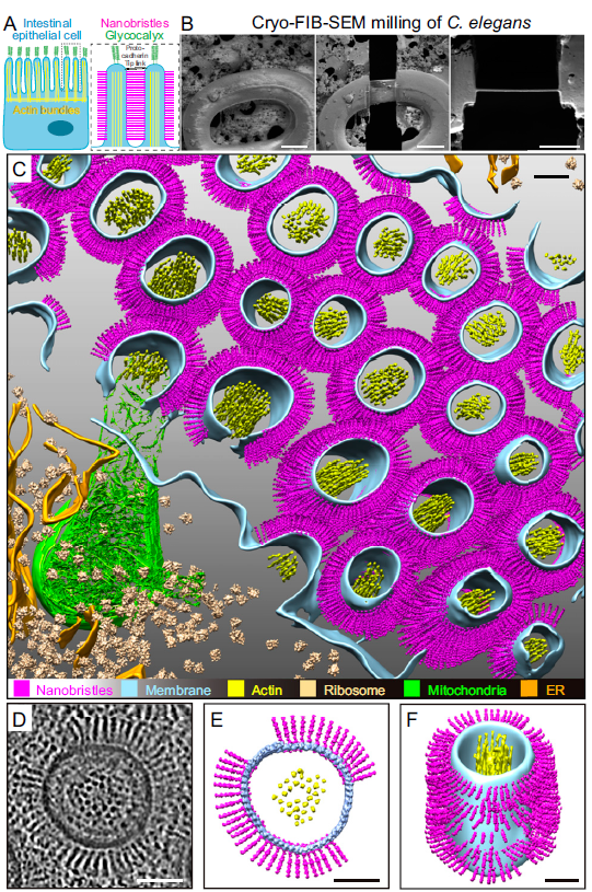 图 1. 对秀丽隐杆线虫肠道刷状边缘进行原位冷冻电子断层成像实验,发现微绒毛侧表面有纳米毛