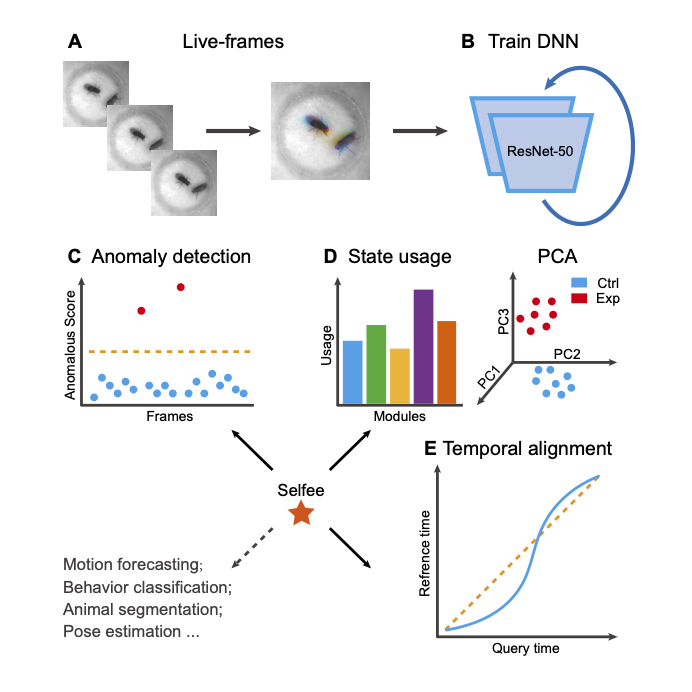 图1,Selfee利用无监督机器学习算法提取动物行为视频中的全局特征。这些特征可用于深入分析动物行为中的异常表现和时间特性。