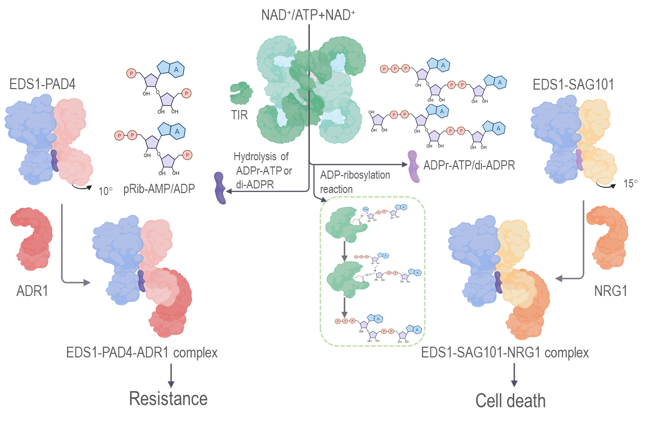 TNLs抗病信号传递依赖于植物独特的EDS1酯酶家族成员,EDS1与其酯酶家族成员PAD4或者是SAG101分别形成异源二聚体来介导致病因子引发的免疫信号通路。在模式植物拟南芥中,EDS1-PAD4与辅助NLR家族的ADR1相互作用来介导植物抗病反应,而EDS1-SAG101与另一辅助NLR家族成员NRG1相互作用来引起植物被侵染部位迅速发生组织坏死(超敏反应),从而限制病原菌生长。
