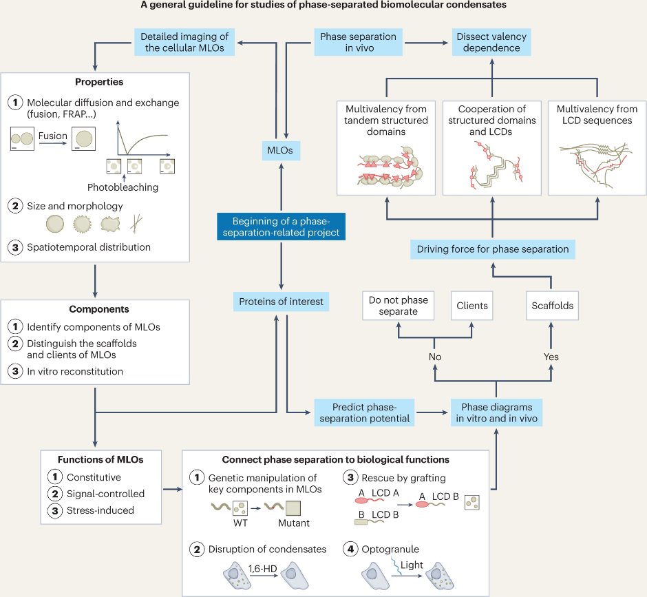 文章首先阐释了相分离的分子机制。无膜细胞器中通常富集了多种组分,其作用不尽相同,因此需要分辨哪些成分是对相分离形成和结构维持不可或缺的支架蛋白;哪些是被招募的配体蛋白。作者随后着重讨论了支架蛋白发生相分离的三种主要分子驱动力:具有良好折叠结构的串联重复结构域之间的多价相互作用、低复杂度结构域多聚组装、以及二者的共同作用。此外,目前已开发出多种基于氨基酸序列特征预测蛋白质相分离潜力的计算工具,文章也对此类工具原理与局限性进行了简要讨论。作者进一步归纳了体内与体外相分离现象相关实验中的一些注意事项:① 相分离是高度计量依赖的现象,系统临界浓度受环境因素(如温度、盐浓度、压力、pH等)的影响,因此需要尽量详细的体外和体内相图来反映在细胞中的相分离能力。并且在体外系统中,研究者应警惕使用拥挤剂(如聚乙二醇)可能带来的假象。② 为进一步观察生理状态下的无膜细胞器,应利用免疫荧光染色或内源标记等手段进行研究,并鉴定其与已知膜细胞器之间的关系。为了防止假阳性结果,需要谨慎评估抗体的特异性,以及荧光标签对蛋白质相分离能力的影响。③ 无膜细胞器具有丰富的生物物理特性,因此对其分子扩散能力、大小与形态的表征,有助于鉴别细胞内不同的相分离体系。④ 多价相互作用是相分离的基础,因此除了对相分离现象的描述外,也需剖析其中支架蛋白多价互作的分子机制。作者特别强调一个常见误区,即低复杂度结构域于相分离既非必要也非充分。