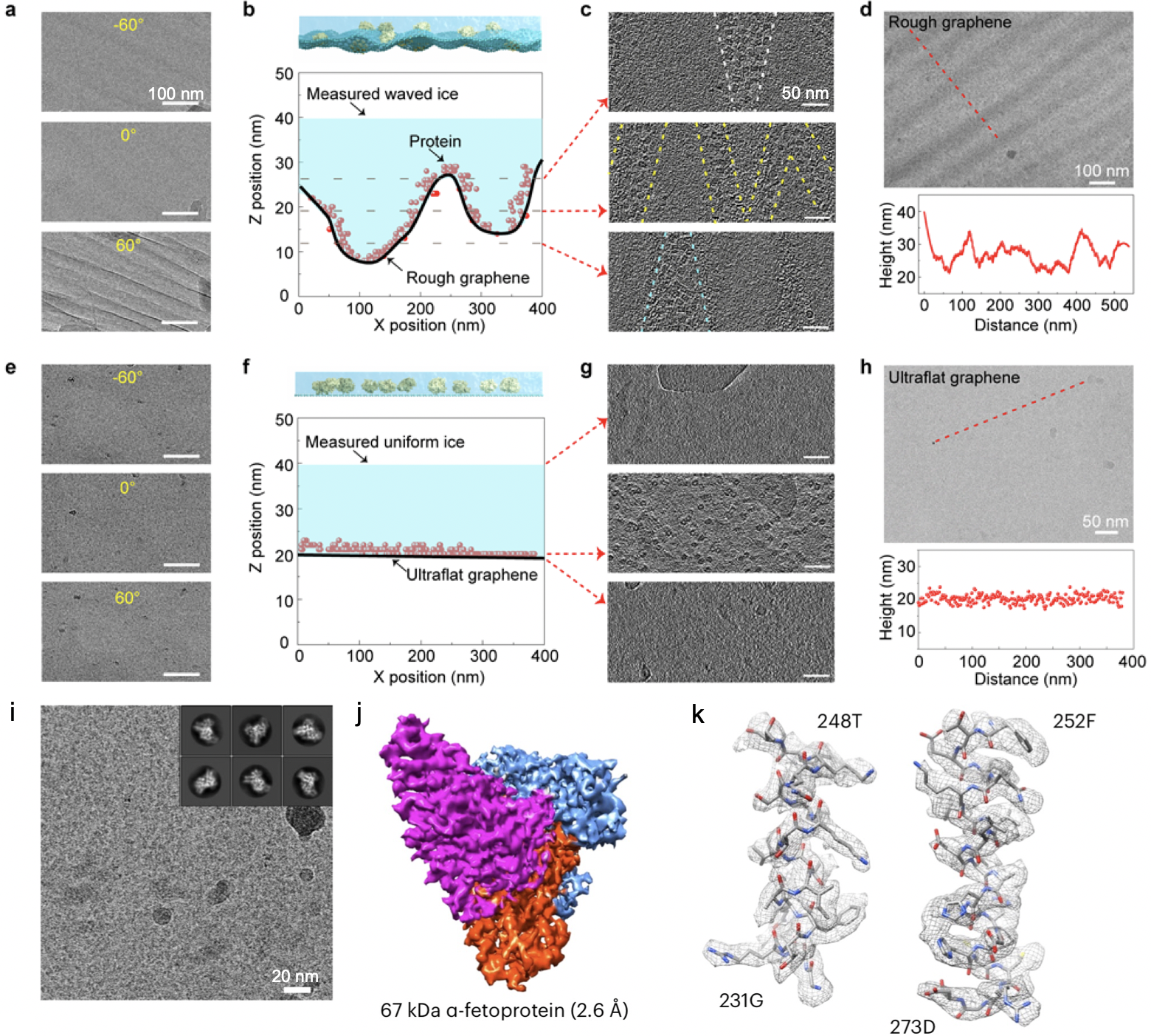 北京大学彭海琳课题组与清华大学王宏伟课题组,以及北京大学韦小丁课题组合作,揭示了冷冻电镜样品支撑膜的表面粗糙度和冰层均一性的关系,并开发了超平整石墨烯电镜载网,解决了均匀薄冰的制备难题。实验表明,超平整石墨烯支撑膜有助于制备更薄更均匀的玻璃态冰,背景衬度低,有利于高信噪比和高分辨率的冷冻电镜成像。使用超平整石墨烯支撑膜,他们对三种分子量较小的蛋白质,链霉亲和素蛋白(52 kDa)、血红蛋白(64 kDa)和甲胎蛋白(67 kDa),进行结构解析,分别得到了2.2 Å、3.5 Å和2.6 Å的高分辨率重构。他们还证明该超平整石墨烯载网在冷冻电子断层扫描重构(cryo-ET)等领域有良好的应用前景。