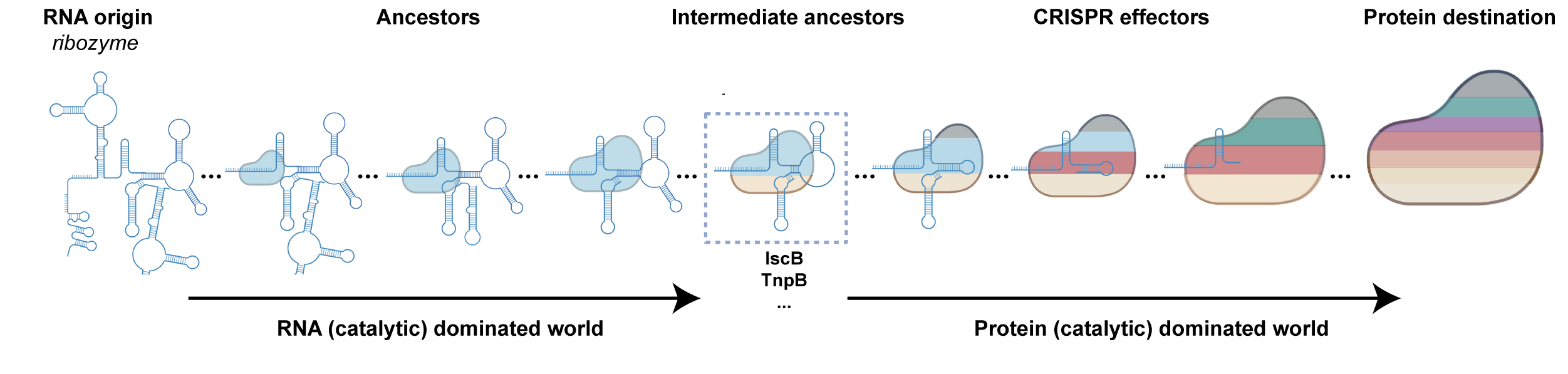有趣的是,课题组通过比较该系统与具有代表性的II类 CRISPR-Cas RNP效应复合物中的Cas蛋白和gRNA分子量,发现了一个“此消彼长”的相互关系,即在一个效应复合物中,如果Cas蛋白越大,gRNA则越小。这样的分析,帮我们重新审视RNA在CRISPR效应蛋白中不可或缺的重要作用,尤其是在小型和微型的CRISPR-Cas系统中。同时,对于以缩小Cas蛋白分子量为目标的研究,或许要适当增加RNA部件,以维持系统活性。结合“RNA 世界”假说,课题组提出了CRISPR-Cas效应复合物可能起源于RNA核酶的进化假说。在这一段历程中,可能存在一段由RNA主导(而不是蛋白)的进化阶段,负责核酸靶向和切割,蛋白则主要起到辅助作用,用以增强RNA核酶活性(图4)。课题组也意识到,这些古早的系统可能已经不存在,即使存在,以Cas蛋白为主要参考的挖掘方法可能也无法鉴定到它们。然而,大量挖掘目前的CRISPR-Cas效应复合物,揭示其中RNA逐渐被蛋白质取代的原理,也许能帮助我们通过计算机还原那个曾经的世界。在那个世界里,RNA是生命活动的主要执行者。由此看来,结构性、功能性RNA在未来的生物技术发展中,是值得关注的潜力分子。